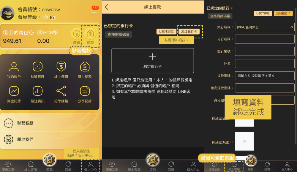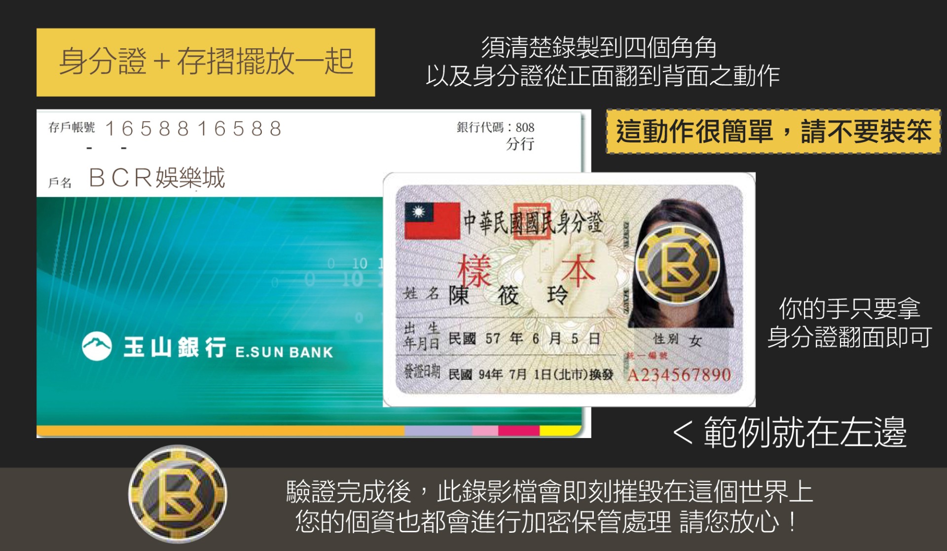 提供您本人帥氣與美麗的 『身分證 正反面』 與 『存摺封面照』 ( 需顯示完整清楚資料唷 )需擺設在一起 清楚錄製『5秒鐘的時間』 (身分證手動翻面) ,回傳給可愛的客服。